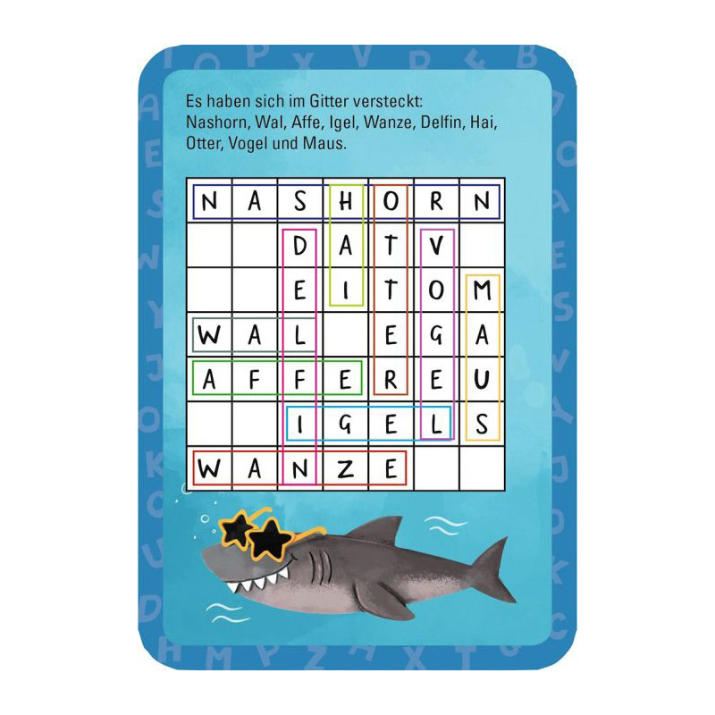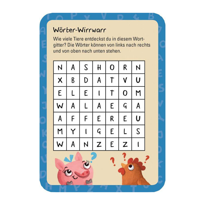 Ob Buchstabenjonglage oder Wortakrobatik – in diesem Kartenset dreht sich alles um knifflige und lustige Rätsel rund um Sprache und Wörter. Mal geht es ums richtige Kombinieren von Buchstaben, mal um kreative Wortspiele, die zum Grübeln und Lachen einladen.