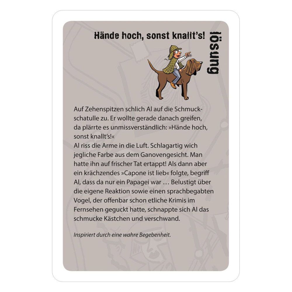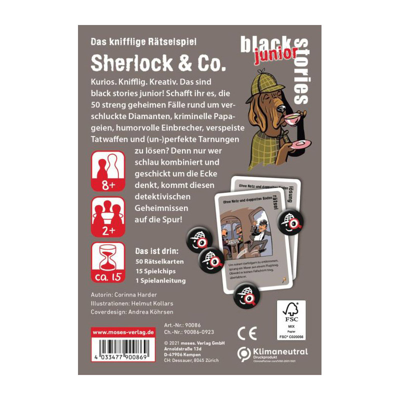 Kartenset | Black Stories Junior – Sherlock & Co. | Inhalt: 50 Karten, 15 Punktechips | Spielzeit ca. 15 Minuten | Maße ca. 9,4 cm x 13,3 cm x 2,4 cm (B x H x T) | Altersempfehlung ab 8 Jahren | Illustrationen: Helmut Kollars | Text: Corinna Harder | ohne Dekoration