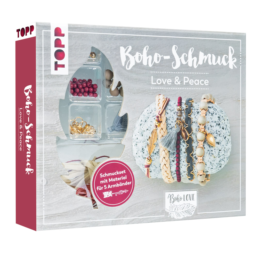 Kreativset | Boho-Schmuckset “Love & Peace” | Farbe Dunkelrot/ Grau | inkl. Anleitung und Material für 5 Armbänder im Boho Look zum Selbermachen. Bänder, Biegeringe, Perlen und Anhänger. Nickelfrei | TOPP 18093 | ISBN 4007742180935
