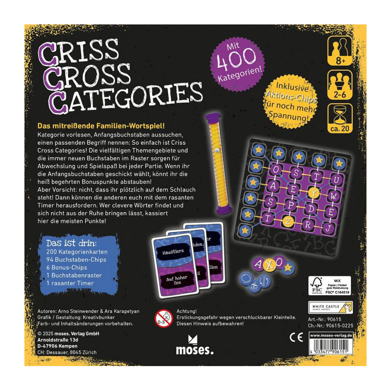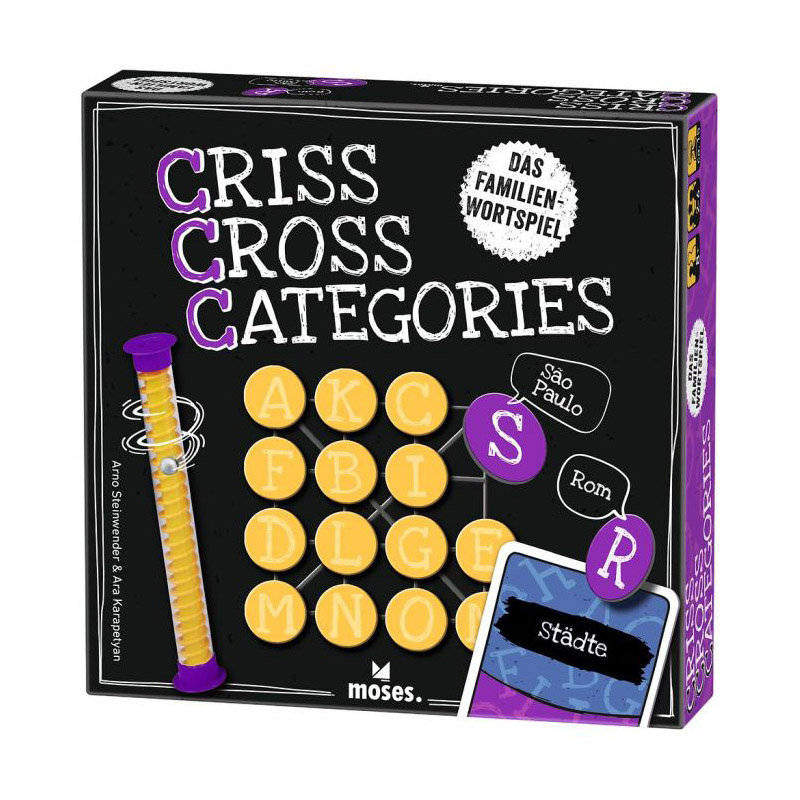 Spannung, Tempo und jede Menge Wortfindungsspaß – das ist “Criss Cross Categories”! Dieses mitreißende Wortspiel kombiniert die besten Elemente aus Stadt-Land-Fluss und Bingo zu einem einzigartigen Spielerlebnis für die ganze Familie. Wer clever kombiniert und schnell denkt, sammelt Punkte und sichert sich den Sieg. Doch Vorsicht: Der innovative Timer mit Kugelmechanismus sorgt für zusätzlichen Nervenkitzel!