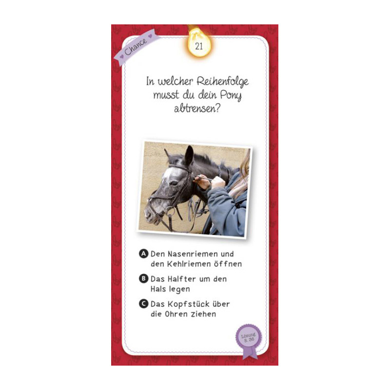 Was ist ein “Handwechsel”? Welche Trense ist für ein Pferd angenehm zu tragen? Und wie viele Jahre hat das älteste Pferd der Welt gelebt? Ein Quizspiel für echte Pferdenarren! Mit über 80 Fragen zu den Themen: im Sattel, Pferderassen, Körperbau, Pflege, Zubehör, Disziplinen.