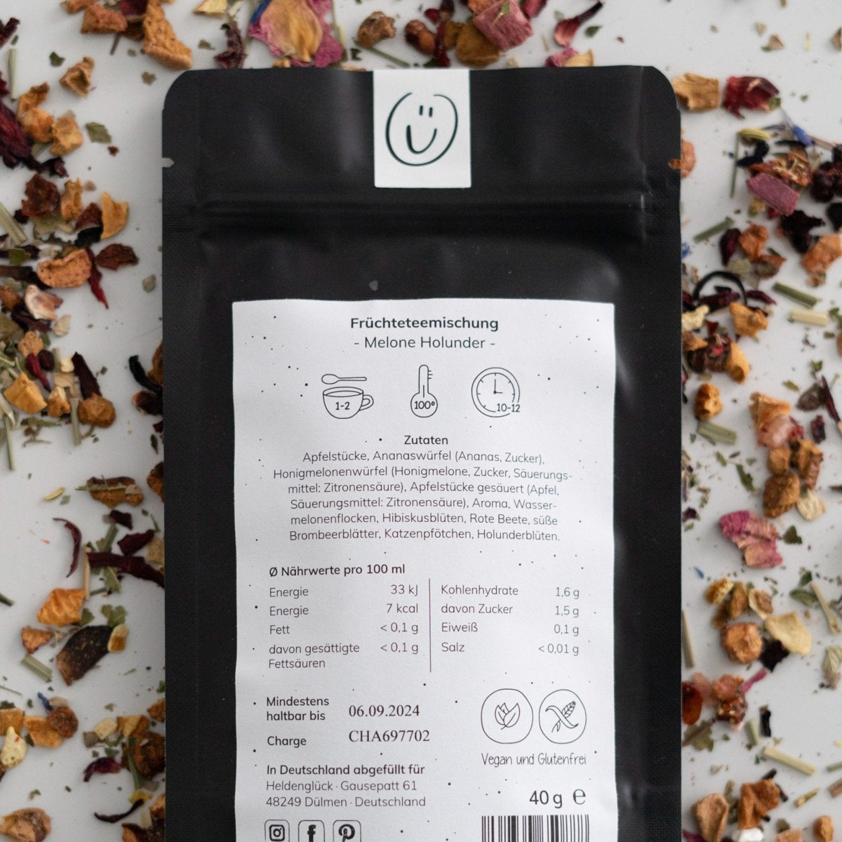 Früchteteemischung | Melone Holunder Geschmack | 40g | Krafttüte Schwarz | Vegan und Glutenfrei | ohne Dekoration