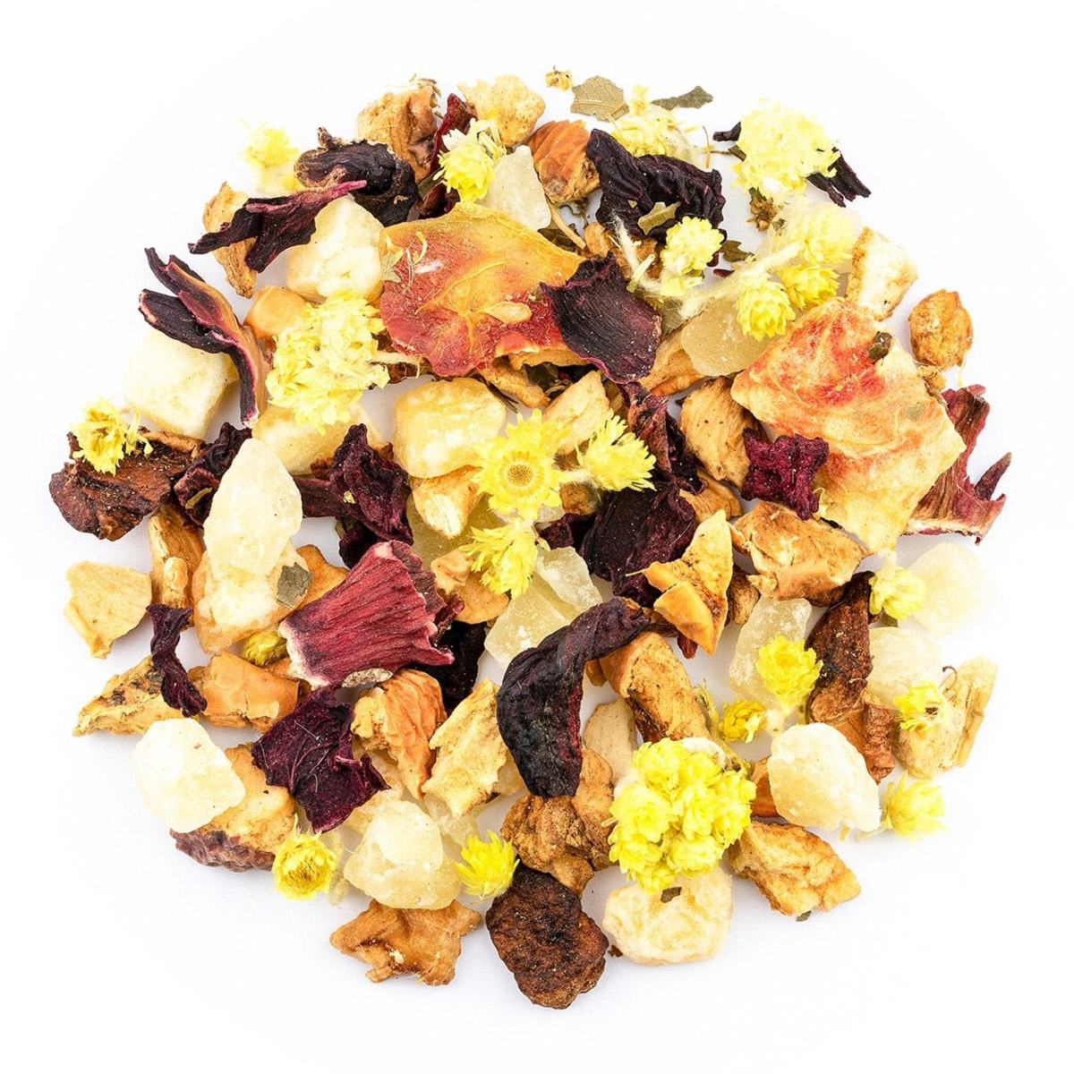 Apfelstücke, Ananaswürfel (Ananas, Zucker), Honigmelonenwürfel (Honigmelone, Zucker, Säuerungsmittel: Zitronensäure), Apfelstücke gesäuert (Apfel, Säuerungsmittel: Zitronensäure), Aroma, Wassermelonenflocken, Hibiskusblüten, Rote Beete, süße Brombeerblätter, Katzenpfötchen, Holunderblüten.