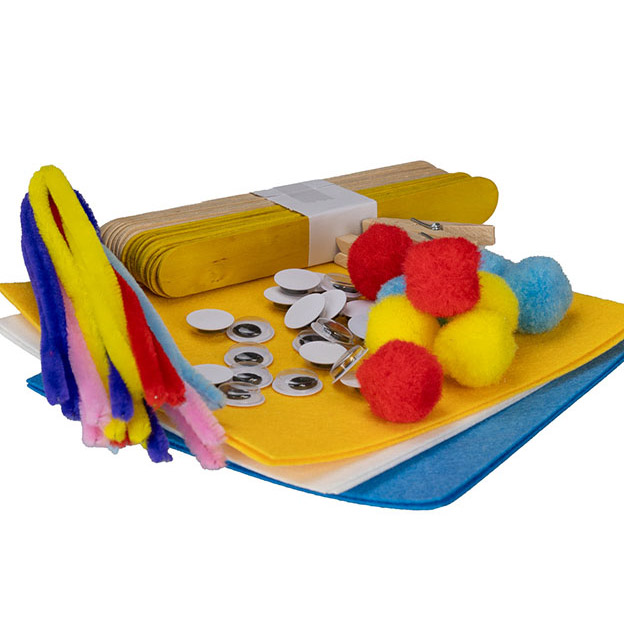 buntes Bastelmaterial wie z.B. Wackelaugen, Wäscheklammer, Chenilledraht, Filz u. v. m. | 8 Anleitungen inkl. Vorlagen | Mitmachbuch mit 16 Seiten | Für die Bastelanleitungen werden zusätzlich noch haushaltsübliche Gegenstände wie Kleber, Schere oder Ähnliches gebraucht.
