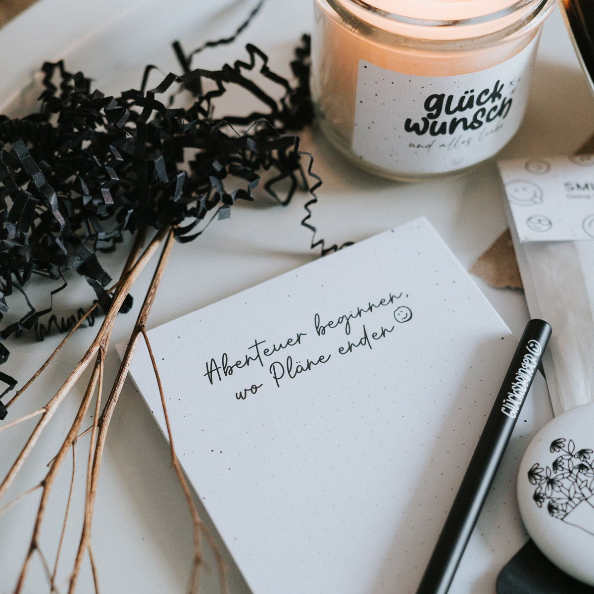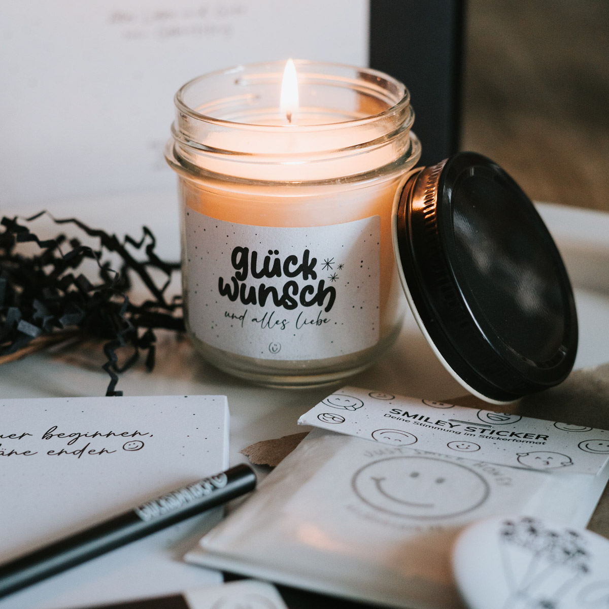 Geschenkbox zum Geburtstag | Inhalt: Postkarte, Notizblock, Bleistift, Kerze im Glas