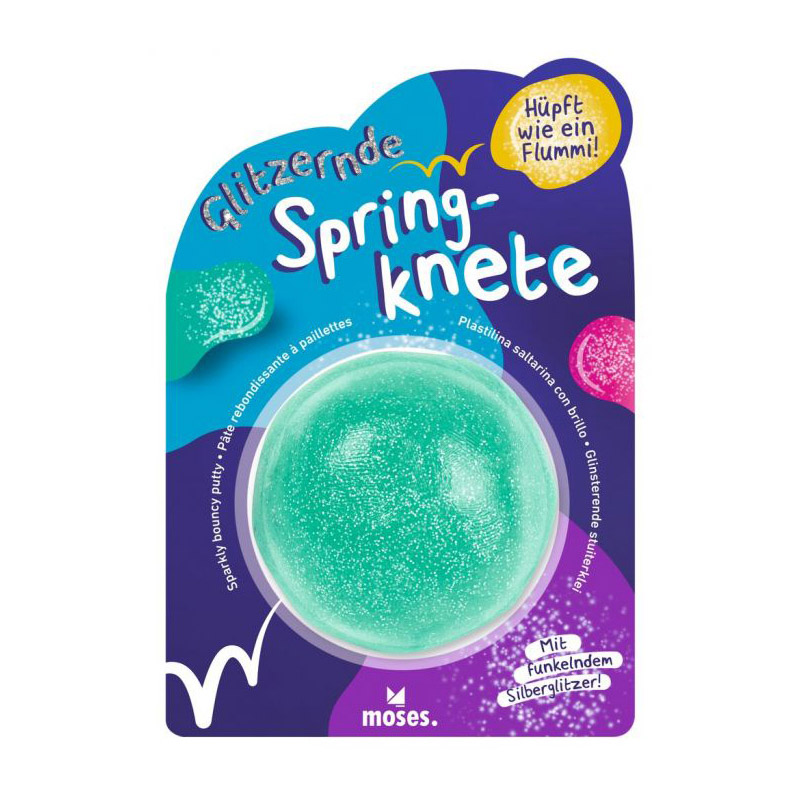 Hüpft wie ein Flummi, lässt sich formen wie Knete! Formt man die glitzernde Springknete zu einem Ball und lässt sie aufprallen, hüpft sie wild umher. So hat man gleich doppelt Spaß! Die Springknete ist in sechs knalligen Farben mit funkelndem Silberglitzer erhältlich und kommt in einer Dose. So ist sie das perfekte Mitbringsel!