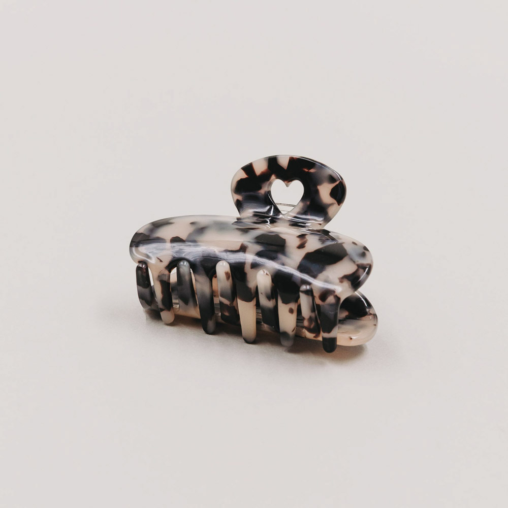 Die große Haarspange Herz Leo vereint stilvolle Eleganz mit praktischer Funktionalität. Ihr marmoriertes Finish in warmen Braun- und Schwarztönen macht sie zu einem zeitlosen Accessoire, das sich mühelos in jeden Look integrieren lässt.