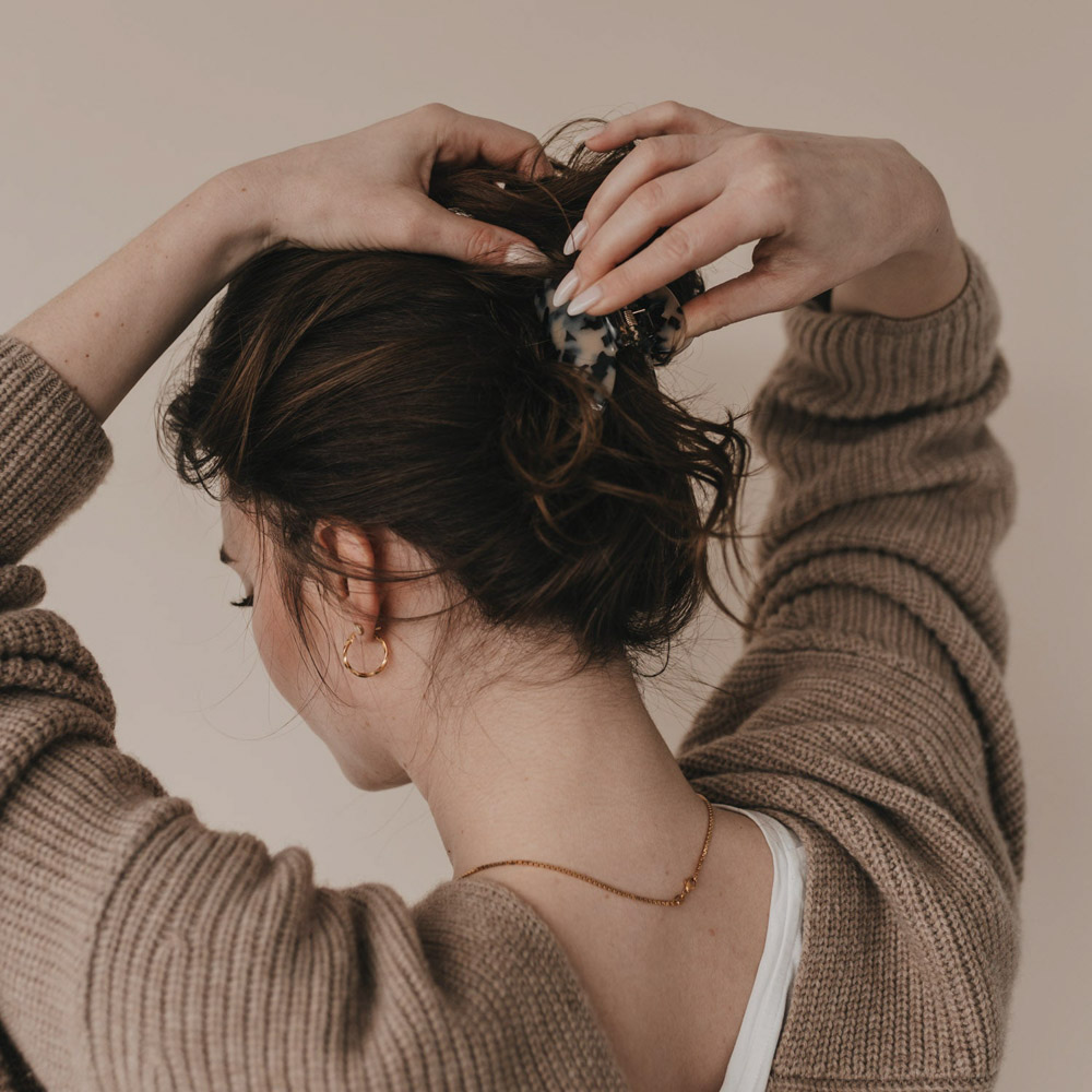 Die Haarklammer besteht aus Acetat, einem nachhaltigen Material auf Basis nachwachsender Rohstoffe. Im Vergleich zu herkömmlichem Plastik ist sie bruchsicherer, langlebiger und besonders beständig – für langanhaltende Freude an deinem Haar-Accessoire! Feder & Stift aus Metall