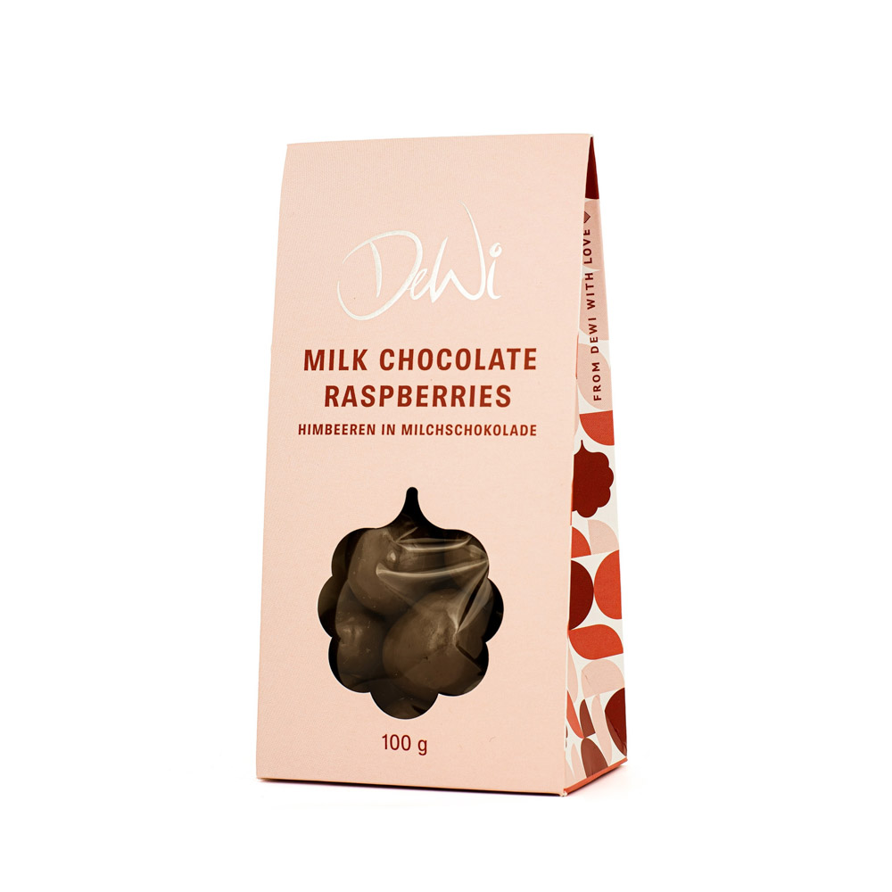 Himbeeren in Milchschokolade | Geschenkverpackung aus Karton | 100g | ohne Dekoration
