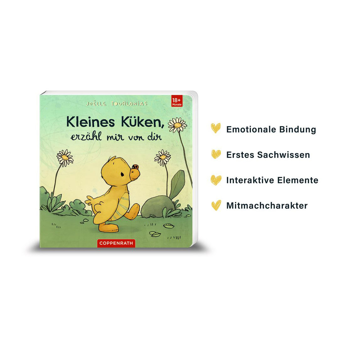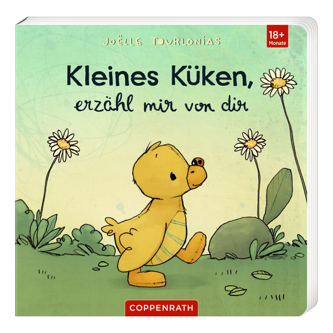 Pappbilderbuch | “Kleines Küken, erzähl mir von dir” | Altersempfehlung: ab 18 Monaten | Seiten: 16 | Format: 16 x 16 | Cover: Pappe | Einband: mit Spotlack | Ausstattung: mit Schieber | Joëlle Tourlonias (Autor/Autorin, Illustration) | ISBN: 978-3-649-64928-1 | ohne Dekoration