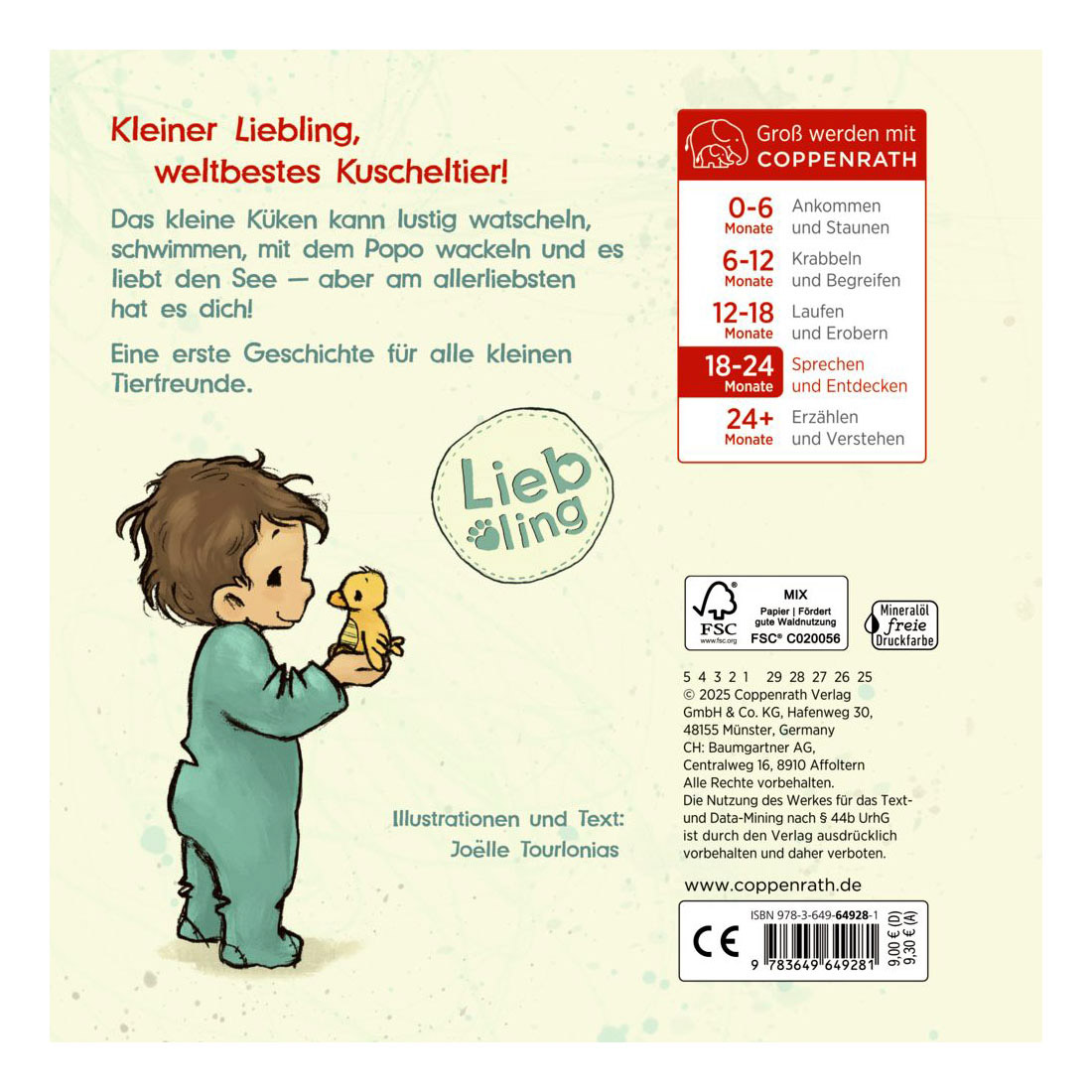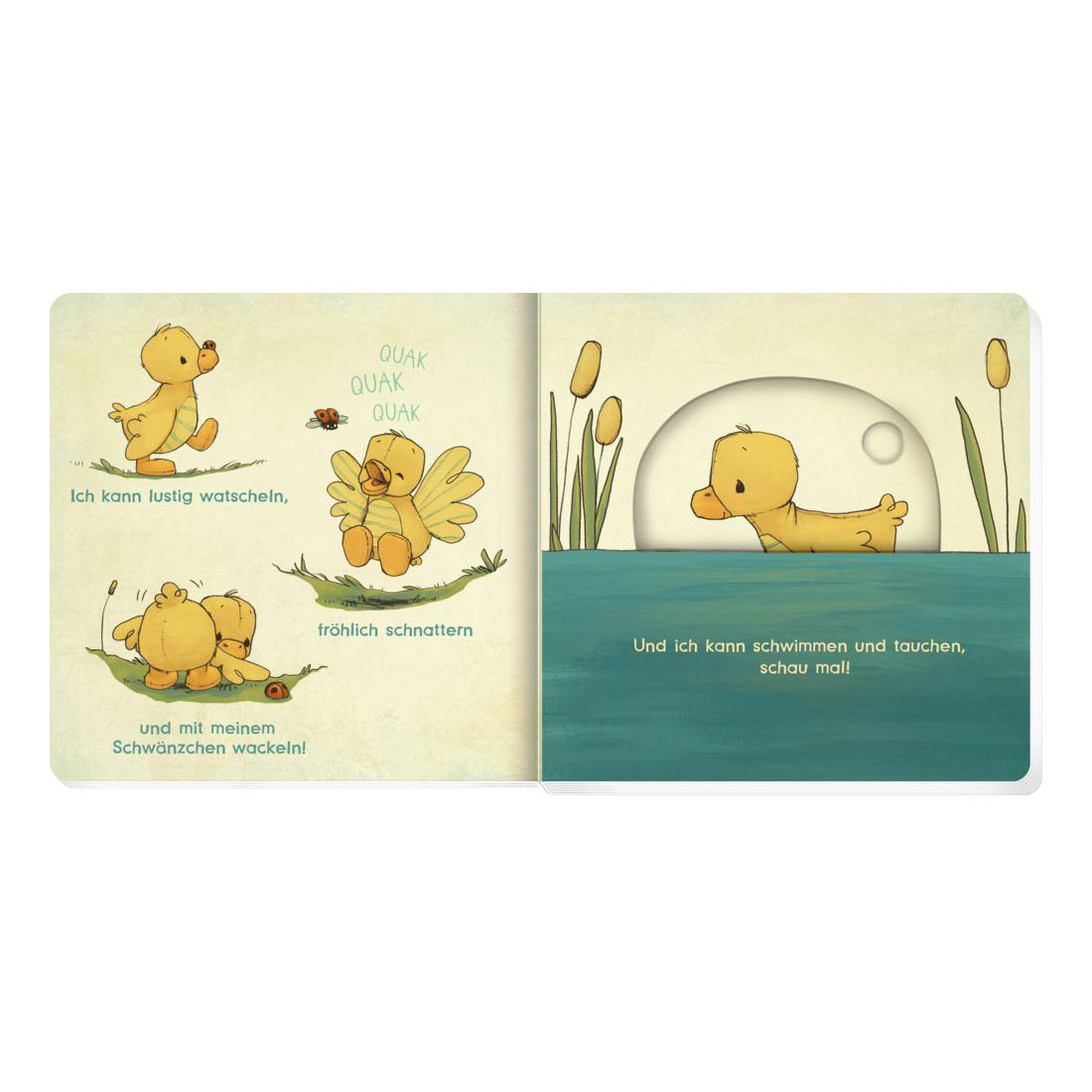 Ich bin das kleine Kuschelküken! Schau mal, ich kann lustig watscheln, schwimmen, mit dem Popo wackeln und ich liebe Wasser – aber am allerliebsten hab ich dich!