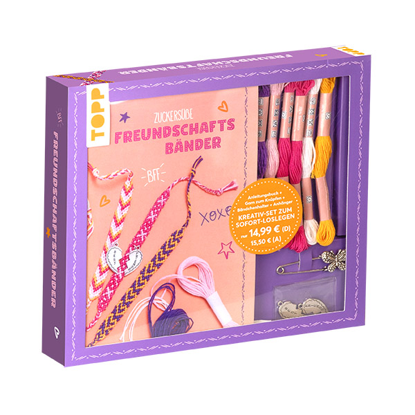 Kreativset | Zuckersüße Freundschaftsbänder | inkl. Anleitungsbuch, Knüpfgarn in 5 Farben (100% Baumwolle), Bändchenhalter, Anhänger in Herzform | TOPP 18093 | ISBN 9783735891563