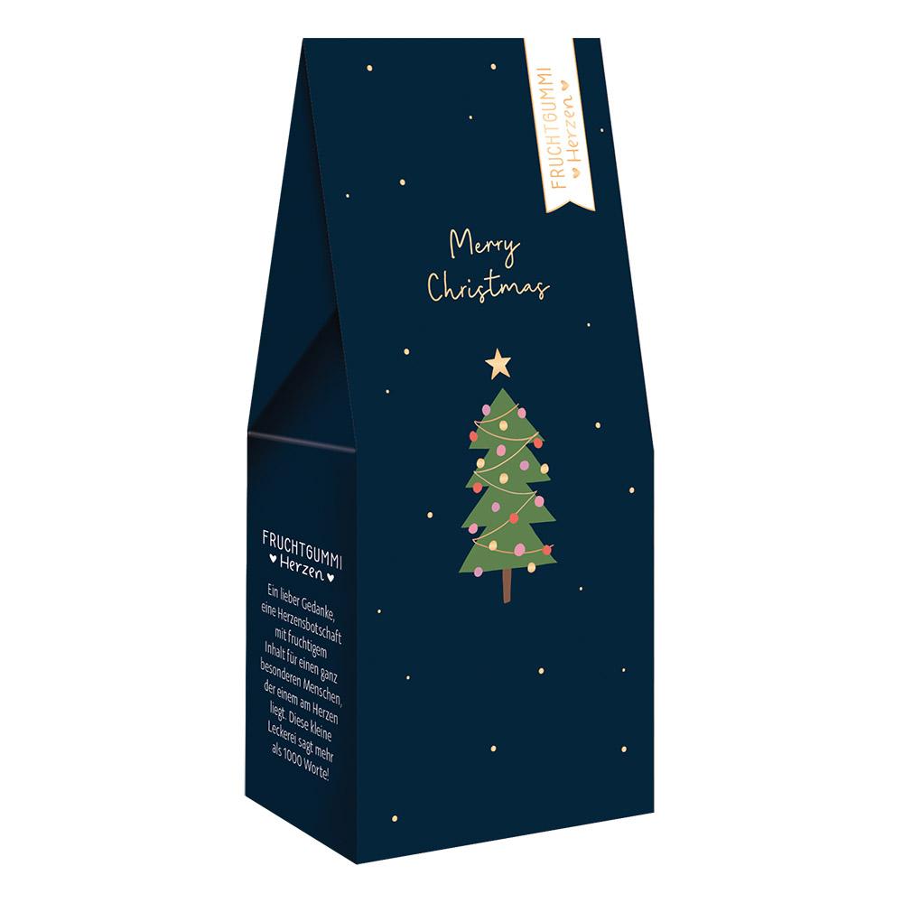 Fruchtgummi-Herzen | Spruch: Merry Christmas | Gold-Veredelung auf der Verpackung | 6,5 x 14,5 cm | glutenfrei & laktosefrei | ohne Dekoration