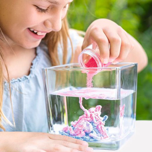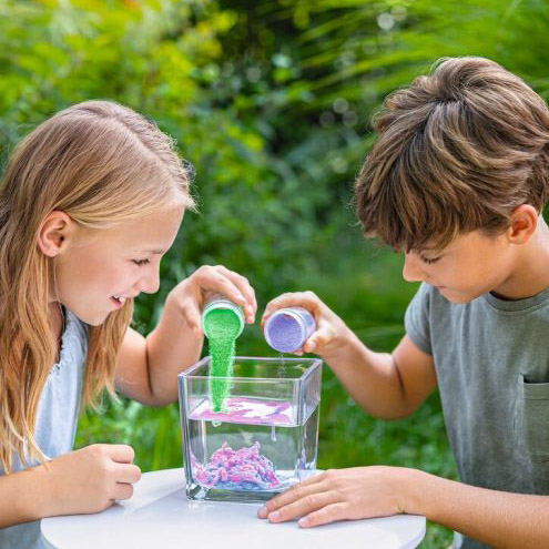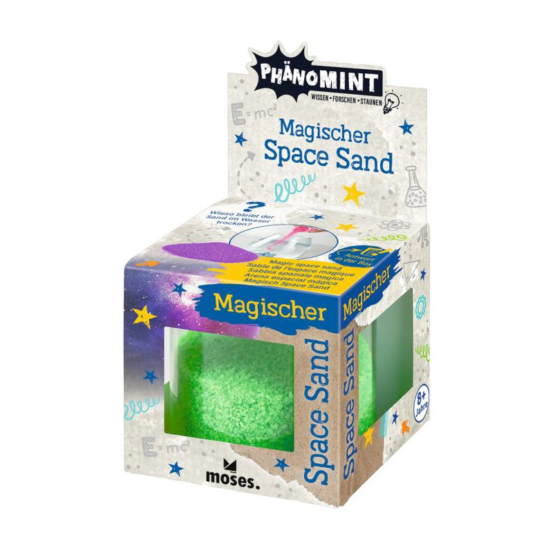 Skurrile Formen unter Wasser und trockener Sand an der Luft: Der magische Space Sand garantiert faszinierenden Spielspaß für Kinder! Wird der bunte Sand in Wasser geschüttet, entstehen verrückte Formen. Wird er wieder herausgeholt, ist er wie von Zauberhand völlig trocken. Doch wieso bleibt der blaue, grüne, pinke oder lilafarbene Sand trocken? Das lernen Kinder in den beiliegenden Informationen zum wissenschaftlichen Phänomen „hydrophober Sand“.