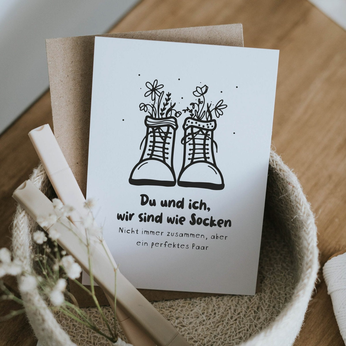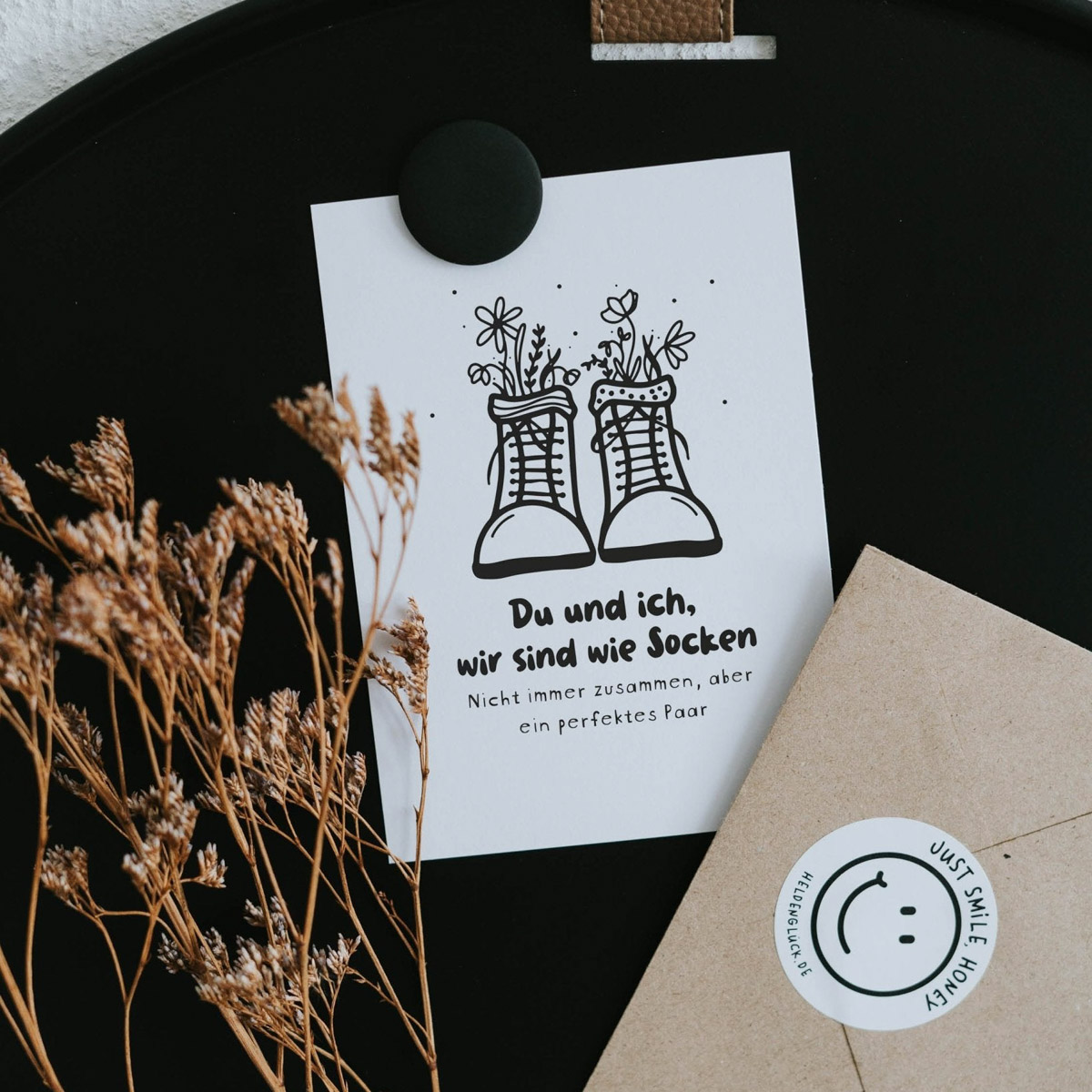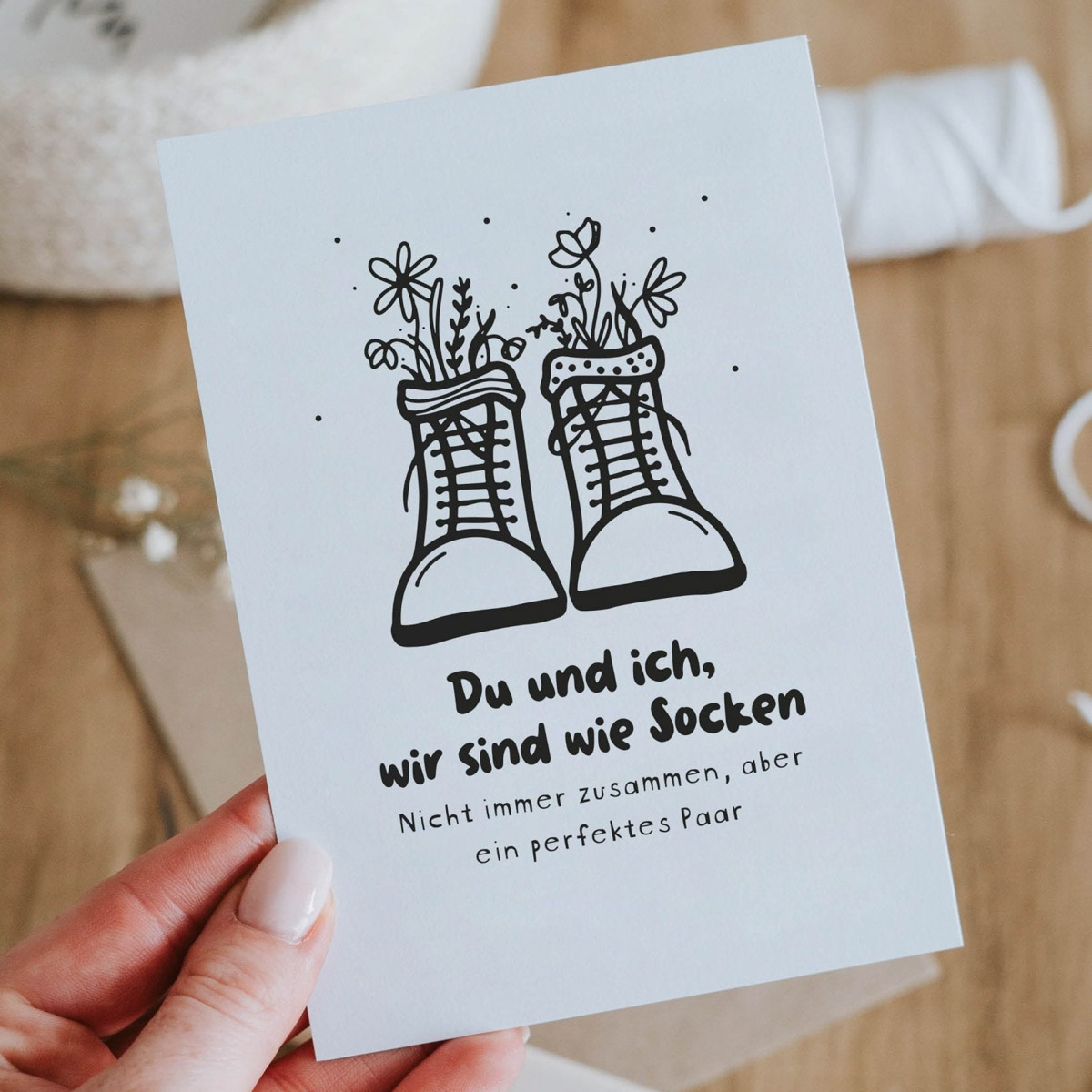 Postkarte | Motiv “Du und ich, wir sind wie Socken. Nicht immer zusammen, aber ein perfektes Paar” | Format A6 | 400g Naturpapier | ohne Dekoration
