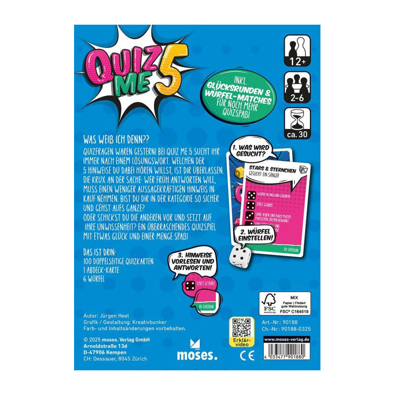 Wer kann mit den wenigsten Hinweisen die richtige Lösung erraten? Quiz Me 5 kombiniert Wissen mit Spannung und sorgt für knifflige Rätselrunden. Mit über 1.000 Hinweisen aus verschiedensten Themenbereichen gilt es, das eigene Wissen clever einzuschätzen – denn je weniger Tipps benötigt werden, desto mehr Punkte gibt es!