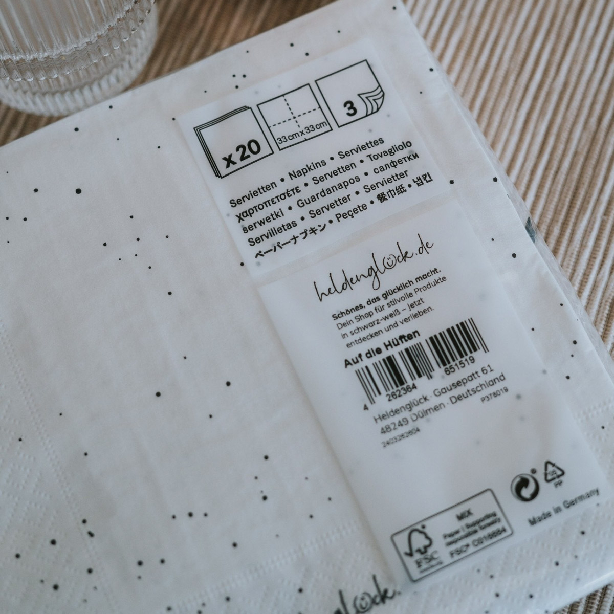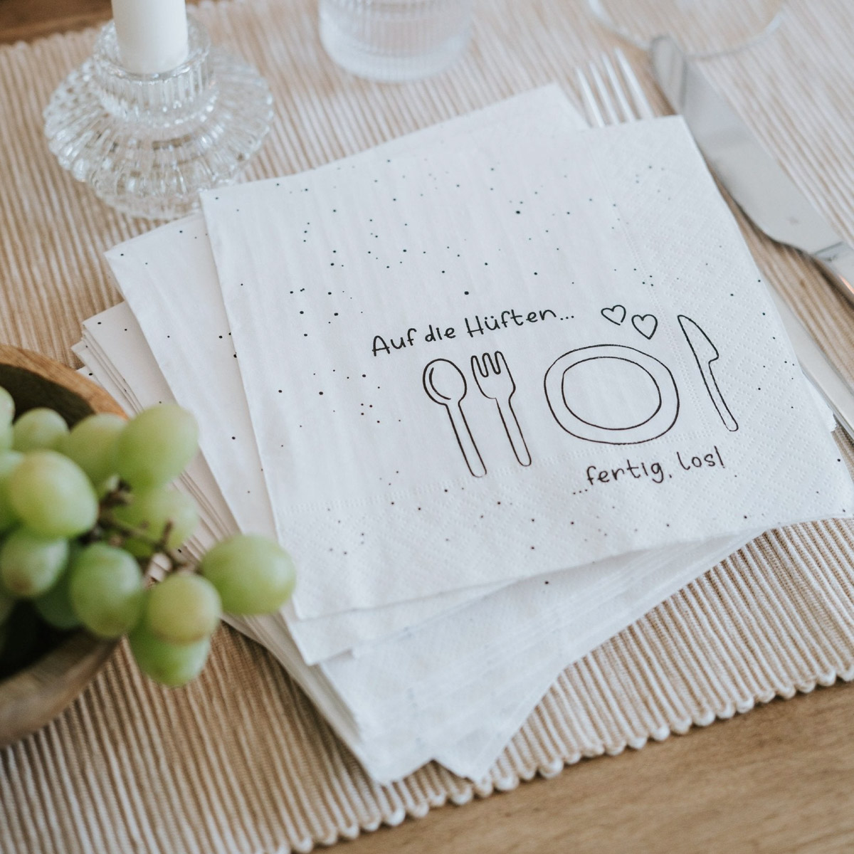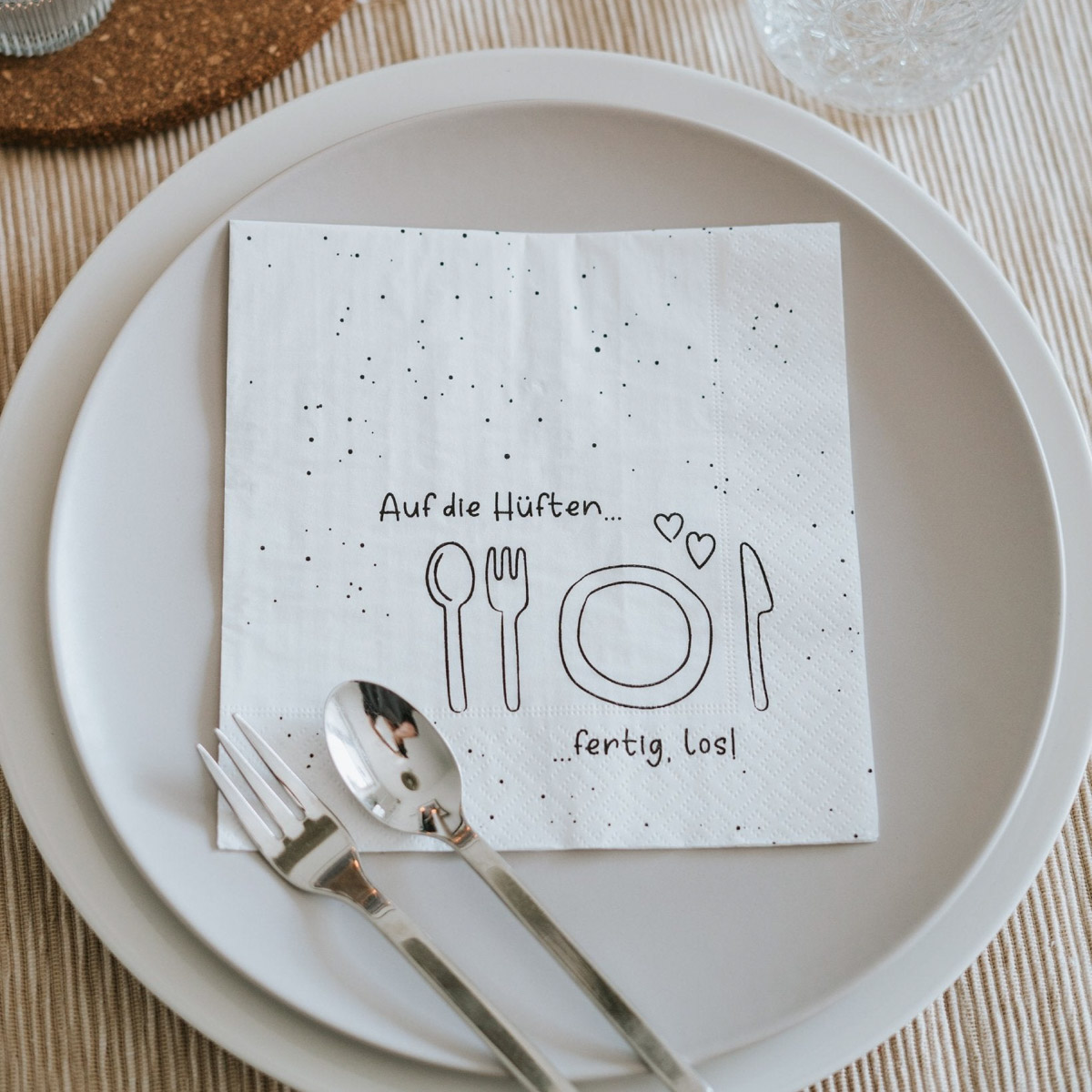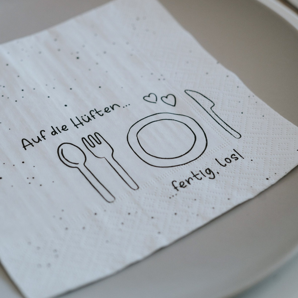 Servietten | Spruch “Auf die Hüften fertig los” | 20 Stück | 33 x 33 cm | robustes und umweltfreundliches Papier | 3-lagig (Extra saugfähig und stabil für vielseitigen Einsatz) | ohne Dekoration