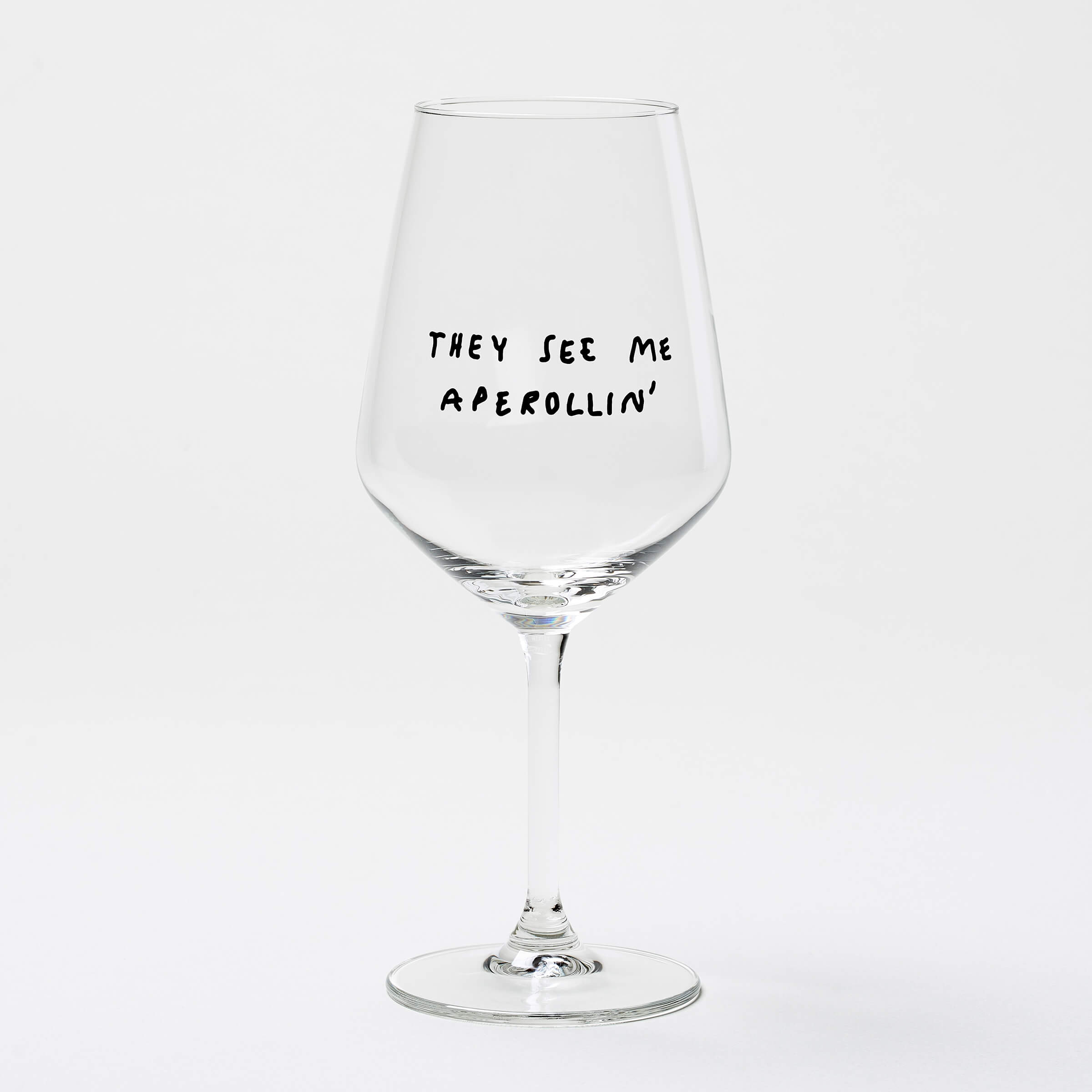 Exklusive Weingläsern, die alle wichtigen Weinheiten, äh Weisheiten, perfekt auf den Punkt bringen. Die Größe der Gläser ist ein echter Allrounder und nimmt einfach alles: Weiß, Rot und Rosé. Salut! Dieses Weinglas hat den Spruch “They See Me Aperollin” aufgedruckt.