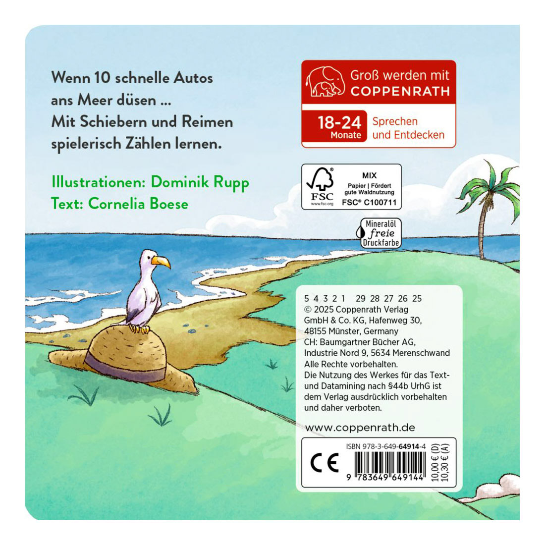 In Wer will schnelle Autos sehn? begleiten Kinder zehn bunte Autos auf ihrem fröhlichen Weg ans Meer. Mit beweglichen Schiebern, charmanten Reimen von Cornelia Boese und den farbenfrohen Illustrationen von Dominik Rupp entsteht ein rasantes Pappbilderbuch voller Mitmachmomente. Das Zählen von 1 bis 10 wird hier spielerisch gefördert – ideal für kleine Rennfahrerinnen und -fahrer, die Fahrzeuge lieben und dabei die Welt der Zahlen entdecken möchten.
